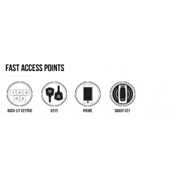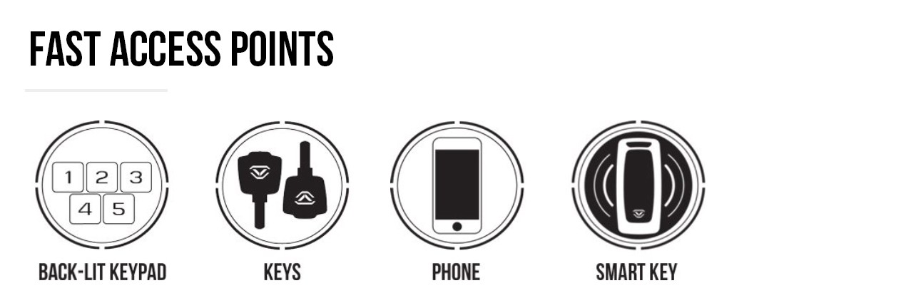 (1) Smart Key and battery, (2) spare manual keys, charging kit with micro-USB cable and adapter, rechargeable lithium-ion battery, mounting hardware, and HD steel security cable.