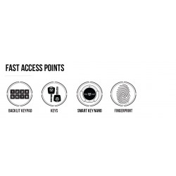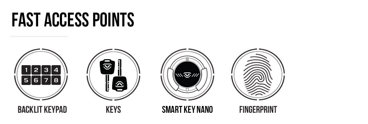 - 4 Fast access pointswith the 20% OVERSIZED Smart Align Biometric Scanner, Smart Key Nano, rapid fire 8-digit backlit keypad, and manual keys. Instant access to your valuables, documents, and firearm(s) with the automatic opening front door.